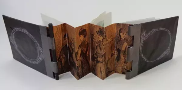 The Piano Hinge book structure is a combination of a concertina spine with signatures sewn into it and a reinforced hinge. The hinge spans the entire spine and when the pin that holds the front and back covers together is removed, an illustration or image is revealed. Participants will create a book with blank pages that can be filled in later, while concentrating in class on making the hinge structure with its hidden and surprising concertina.