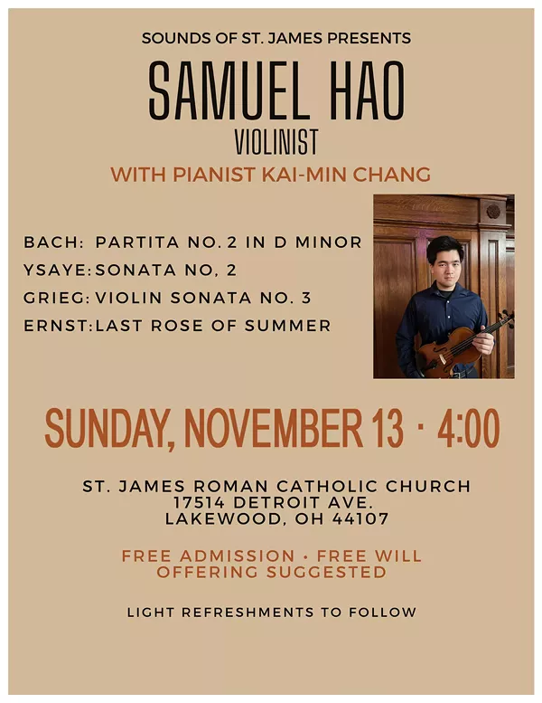 The Sounds of St.James concert series returns Sunday, November 13 at 4 pm with violinist Samuel Hao and pianist Kai-Min Chang performing Bach’s Partita in D Minor,