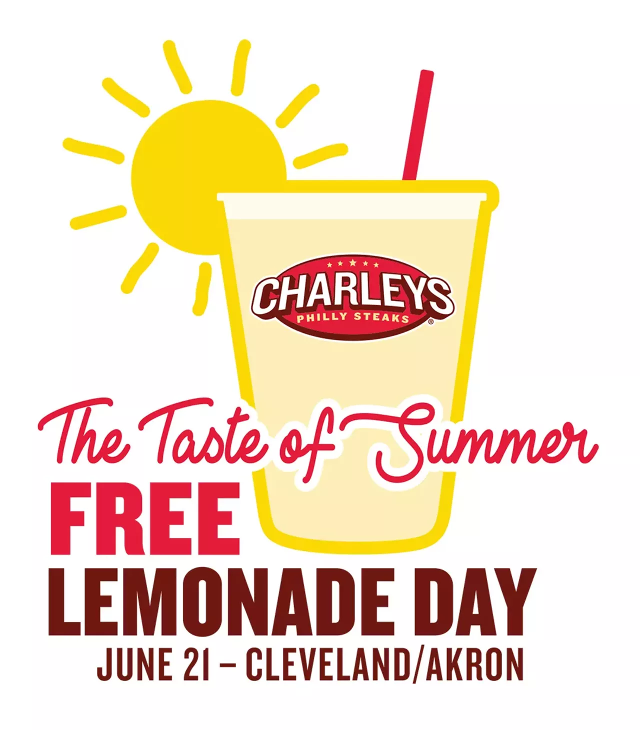 Customers can visit any Charleys location in the Cleveland-Akron area, including the Tower City Center location, to receive their free, regular-sized Original Lemonade during regular operating hours on Thursday, June 21 (no purchase necessary, limit one per customer).