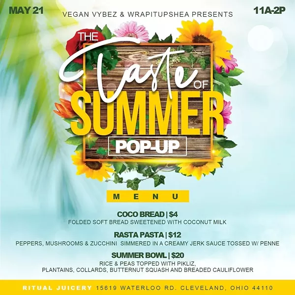 Vegan chefs @wrapitupshea and @veganvybez will team up today to host A Taste of Summer pop-up at Ritual Juicery. The event takes place from 11 a.m. to 2 p.m., and the menu includes Coco Bread, Rasta Pasta and a Summer Bowl. 15619 Waterloo Rd.