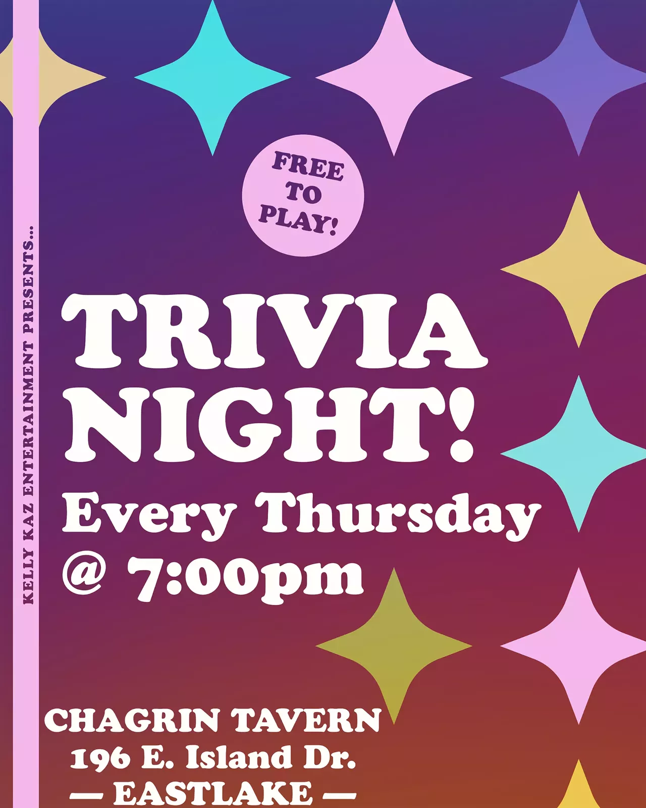 Have you been craving some trivia in your life?! Well you’re in luck! Kelly Kaz Entertainment is doing it every Thursday at Chagrin Tavern in Eastlake! The questions will be a lil mix of anything and everything! There’s 6 rounds with 5 questions each, including a name that tune round! Win fun prizes and gift cards!