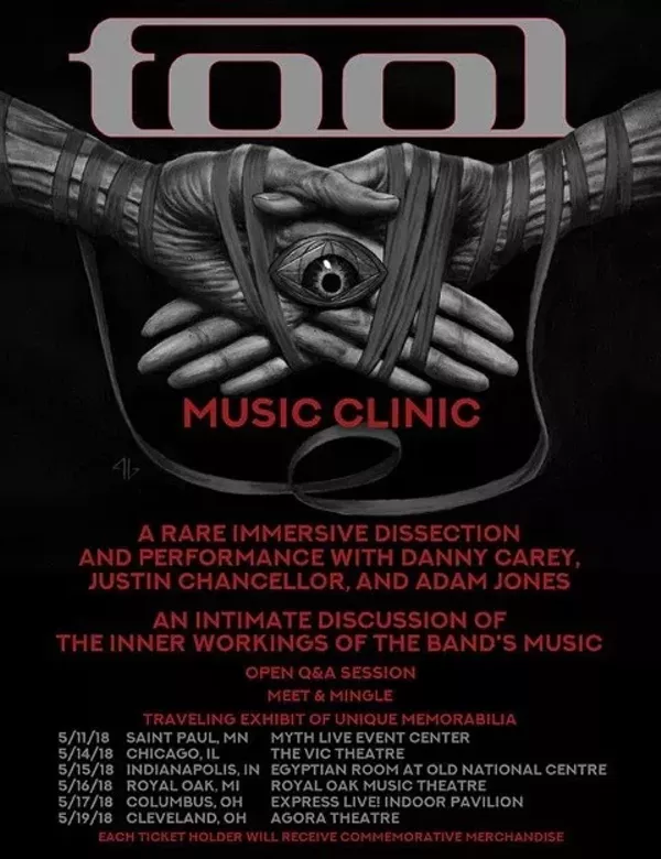 One of the headliners at this year's Rock on the Range, Tool has embarked on a short "music clinic" tour in conjunction with the festival appearance. The event promises “a rare glimpse behind-the-scenes via a series of intimate music clinics.” Drummer Danny Carey, bassist Justin Chancellor and guitarist Adam Jones will discuss a handful of the band’s songs and talk about the process of writing them and then playing them live. Audience members will be able to ask questions via an open discussion and mingle with the band following the session. Ticket holders will receive commemorative merchandise. An accompanying traveling exhibit will feature unique items from the band’s history. The event begins at 6 p.m. Tickets are $500. (Niesel)