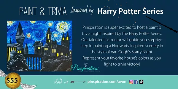 Pinspiration is super excited to host a paint trivia night featuring Harry Potter. Each participant will paint Hogwarts in the style of Van Gogh's Starry Night. Our talented instructors will guide you step-by-step in painting your masterpiece! You can follow along or go rogue by selecting your colors. During this fun time, we will also be playing TRIVIA!! FUN!