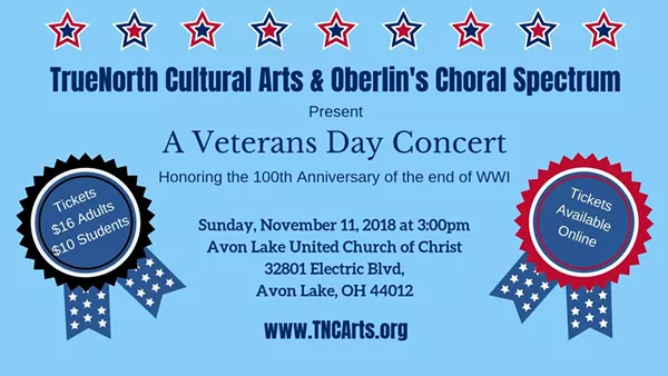 TrueNorth Cultural Arts and Oberlin’s Choral Spectrum will present a concert honoring the 100th anniversary of the end of World War I on Veterans Day, Sunday, November 11, 2018, 3:00 p.m. The Concert will feature John William’s Hymn to the Fallen; Leonard Bernstein’s Chichester Psalms; Dvorak’s 2nd Movement, Largo, from Symphony No. 9, The New World; and Vaughan Williams’ Dona Nobis Pacem.