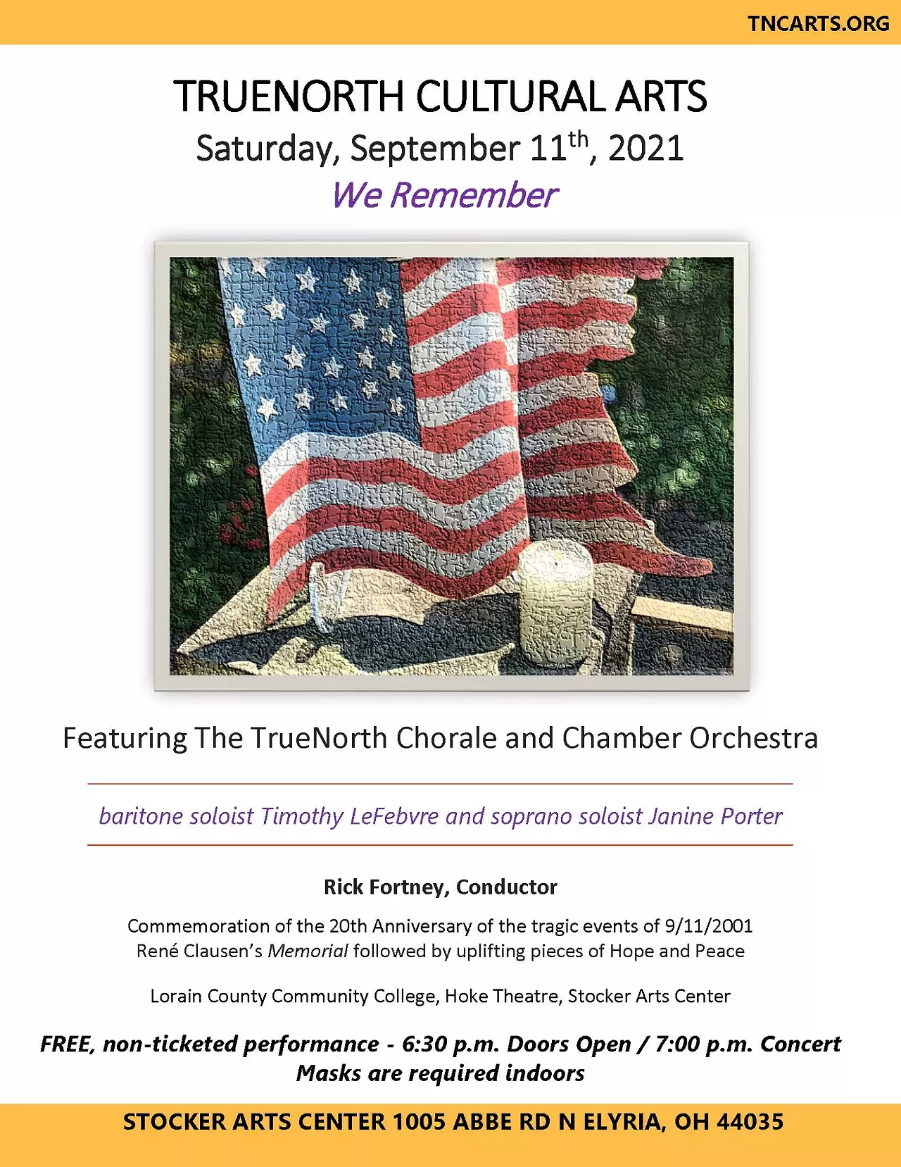 The TrueNorth Chorale and Chamber Orchestra will be in Concert at Stocker Center on Saturday, September 11, 2021, 7:00 p.m. The concert entitled We Remember is a free, non-ticketed performance commemorating the 20th Anniversary of the tragic events of 9.11. Join us on this important day to reflect, renew and remember through the arts. The concert begins with In Paradisum written by Z.R. Stroope, a beautiful piece in honor of those who lost their lives during the pandemic. This will be followed by René Clausen’s Memorial, featuring nationally acclaimed baritone soloist Timothy LeFebvre.