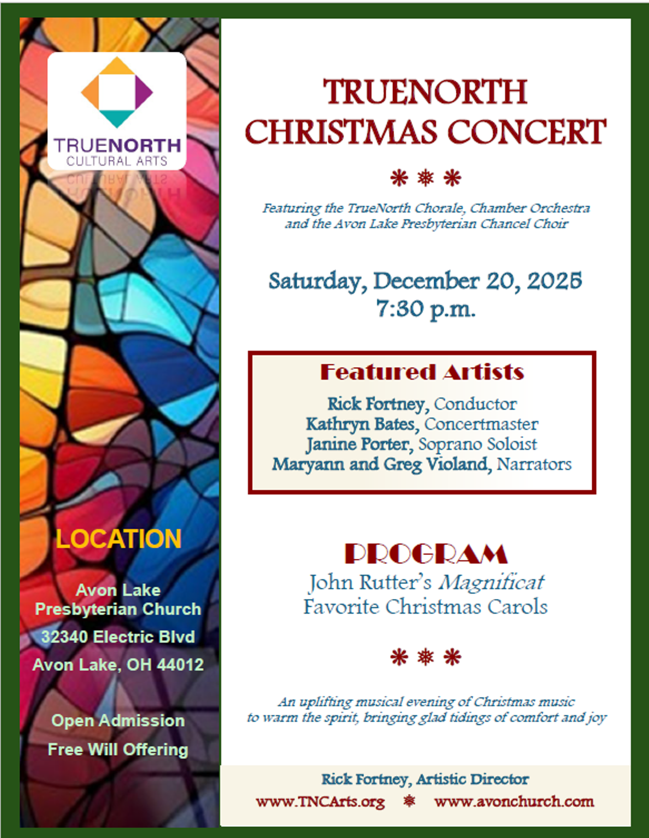 The TrueNorth Chorale and Chamber Orchestra, under the direction of Rick Fortney, will present their annual Christmas Concert on Saturday, December 20th, at 7:30 p.m. at Avon Lake Presbyterian Church, 32340 Electric Blvd., Avon Lake, Ohio. The Concert is open to all, there will be a free will offering to help offset costs.