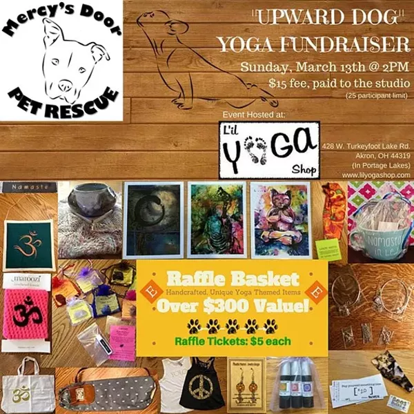 Join us at the Li'l Yoga Shop of Akron to get your OM on and raise some much needed money for the adoptable dogs and pups of Mercy's Door Pet Rescue Inc. during our Upward Dog Yoga Fundraiser! This will be an all levels vinyasa flow yoga class taught by Tracie Zamiska (RYT-225) on Sunday, March 13th at 2:00 P.M. Please go to www.lilyogashop.com to pre-register for the class, limited to 25 participants. The donation for the class is $15.00. There will also be a raffle basket at this event full of yoga themed items donated from many Etsy shops.