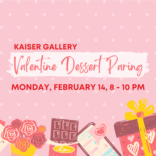 Spend Valentine's with Kaiser Gallery! This February 14, from 8 - 10 pm, bring your Valentine sweetie and enjoy a dessert and cocktail pairing. Select from our Lemon Square and Ginger Negroni (gin, campari, vermouth, muddled ginger, and a touch of ginger juice) for a rich citrus pairing, Profiteroles & Handsome Devil (bourbon, orgeat, amaro nonino with a hint of lemon) for an artisanal chocolate experience, or the Bittersweet Dark Chocolate and the Coco Rosa pairing (rum, creme de cacao, coconut cream and strawberry puree) for a balanced decadent treat. You can also enjoy a flight of all three!