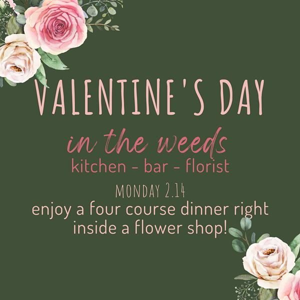 Join us for a four course dinner situated right inside a flower shop! What better way to celebrate Valentine's/Galentine's or just a delicious dinner out than surrounded by roses on February 14th, full bar available with craft cocktails, beer and wine. Reserve your roses ahead of time and have no worries this Valentine's Day!