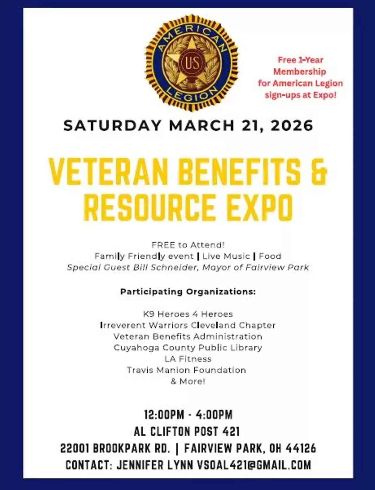 Cleveland Reservists, National Guardsmen & Veterans! Swing by our Veteran Benefits & Resource Expo on Saturday March 21st from 12:00PM to 4:00PM at American Legion Post 421 in Fairview Park to connect with over 20 local organizations, find out about available benefits, get your VA claims questions answered, and meet fellow vets. This FREE in-person event is your chance to get all the info and support you need in one place. Don’t miss out on a day dedicated just to YOU and your community!