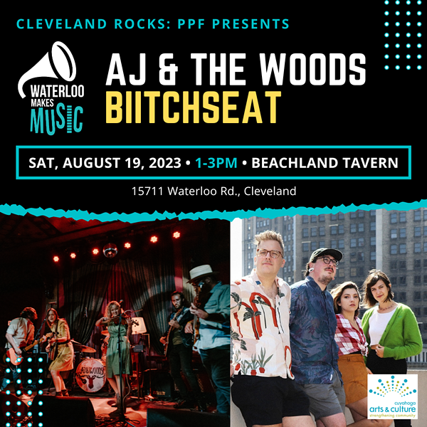 Waterloo Makes Music is a free concert series on Waterloo as a gift to all the music lovers in the community, and a celebration of Cleveland’s amazing musical legacy. AJ & The Woods are an up-and-coming roots rock band home grown in Ohio. They organically blend passionate folk, rock, and blues to bring you one of the most unique and articulate sounds to date. Biitchseat is a dynamic DIY from Cleveland. This event is organized by Cleveland Rocks: Past, Present, Future and supported by Cuyahoga Arts and Culture. Free event!