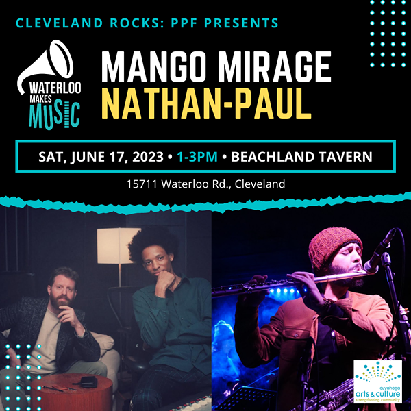 Waterloo Makes Music is a free concert series on Waterloo as a gift to all the music lovers in the community, and a celebration of Cleveland’s amazing musical legacy. Nathan-Paul seeks to inspire all healing activities through sound medicine. Expect saxophone driven jazz/R&B/Funk. Mango Mirage is a cosmic duo from a far-off planet, sent on a mission to save humanity through the power of music and love. With infectious grooves, worldly remixes, and deep cuts, they take you on a journey through time and space. Organized by Cleveland Rocks: PPF with support from Cuyahoga Arts and Culture.