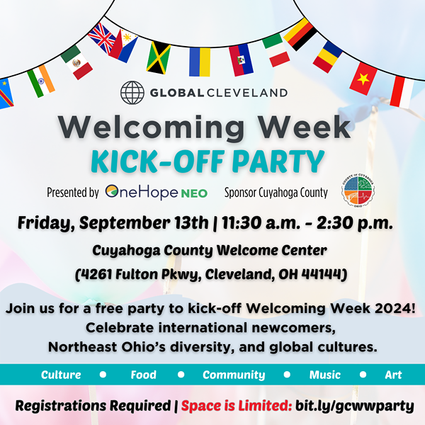 Get ready to party with a purpose! 🎉 Join us as we kick off welcoming week 2024 with a celebration of Northeast Ohio's diversity and global cultures at our exciting kickoff party! Let's come together to welcome and embrace our international newcomers in Cleveland.