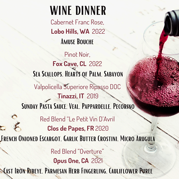 Join us for a five-course wine dinner as we explore red wines from five different regions.