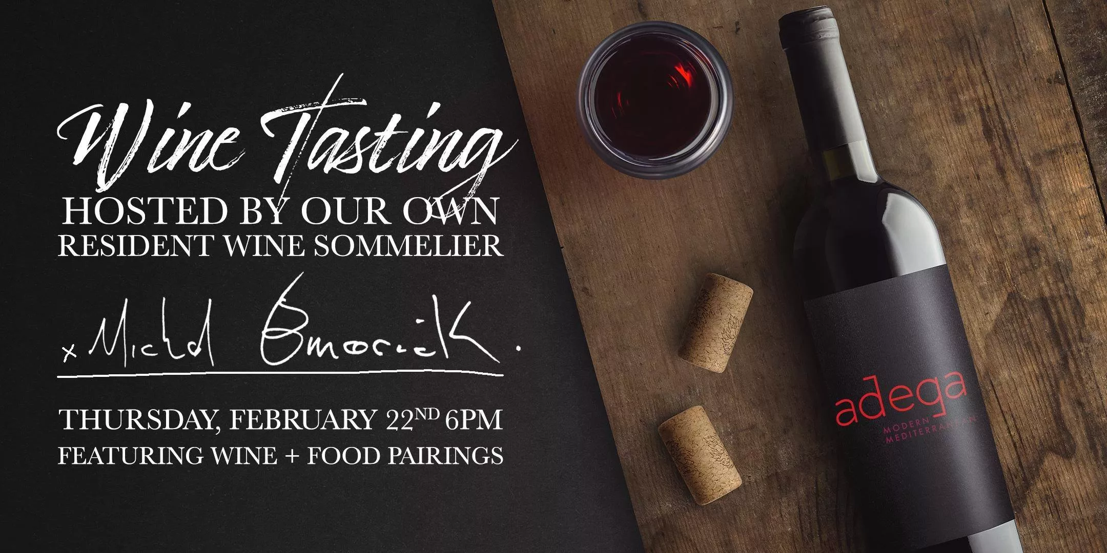 Join Adega for an exquisite wine tasting, hosted by Adega's very own Resident Wine Sommlier, Michel Emerick. Experience an elevated evening tasting tantalizing wines and gaining wine knowledge from only the best. The evening will also include small food offerings that have been crafted to pair with each taste.