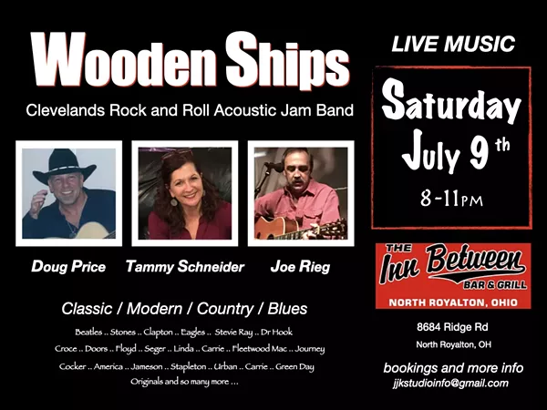 Wooden Ships.. Clevelands Acoustic Jam Band will bring their Rock & Roll show to The Inn Between Bar and Grill located at 8684 Ridge Rd in N. Royalton. Doug Price and Joe Rieg welcome aboard their newest shipmate vocalist Tammy Schneider who will add her talents to the set... variety of material .. Classic, Country, Oldies Modern and more... join us for a fun evening of cold drinks, good food and excellent entertainment ... bookings jjkstudioinfo@gmail.com