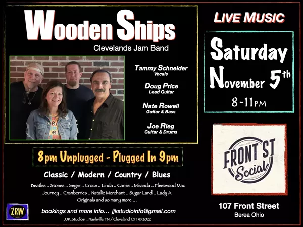Wooden Ships featuring Tammy Schneider, Joe Rieg, Doug Price and Nate Rowell will return to the Front St Social, Saturday, November 5th / 8-11pm .. Unplugged & Plugged In... no cover / limited seating / Front St Social 107 Front St Berea, Ohio https://joerieg.com/wooden-ships .. bookings: jjkstudioinfo@gmail.com / JJK Studios ® ASCAP