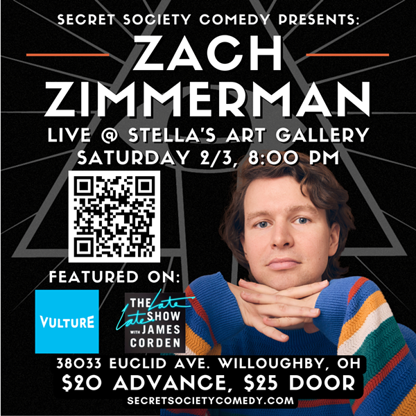 Zach Zimmerman, a Vulture Comic You Should Know, performs LIVE at our pop-up comedy club in downtown Willoughby, so if you need a laugh to end your week on a high note, this is the place to go. Each week, we host the nation's best touring, regional, and local comedians providing a unique comedy club experience in different spaces with different vibes, and Stella's Art Gallery is the perfect venue to attend a "secret" comedy show where you can celebrate life's wins, have a unique date night, or just break up the typical weekend routine with laughs and local art.